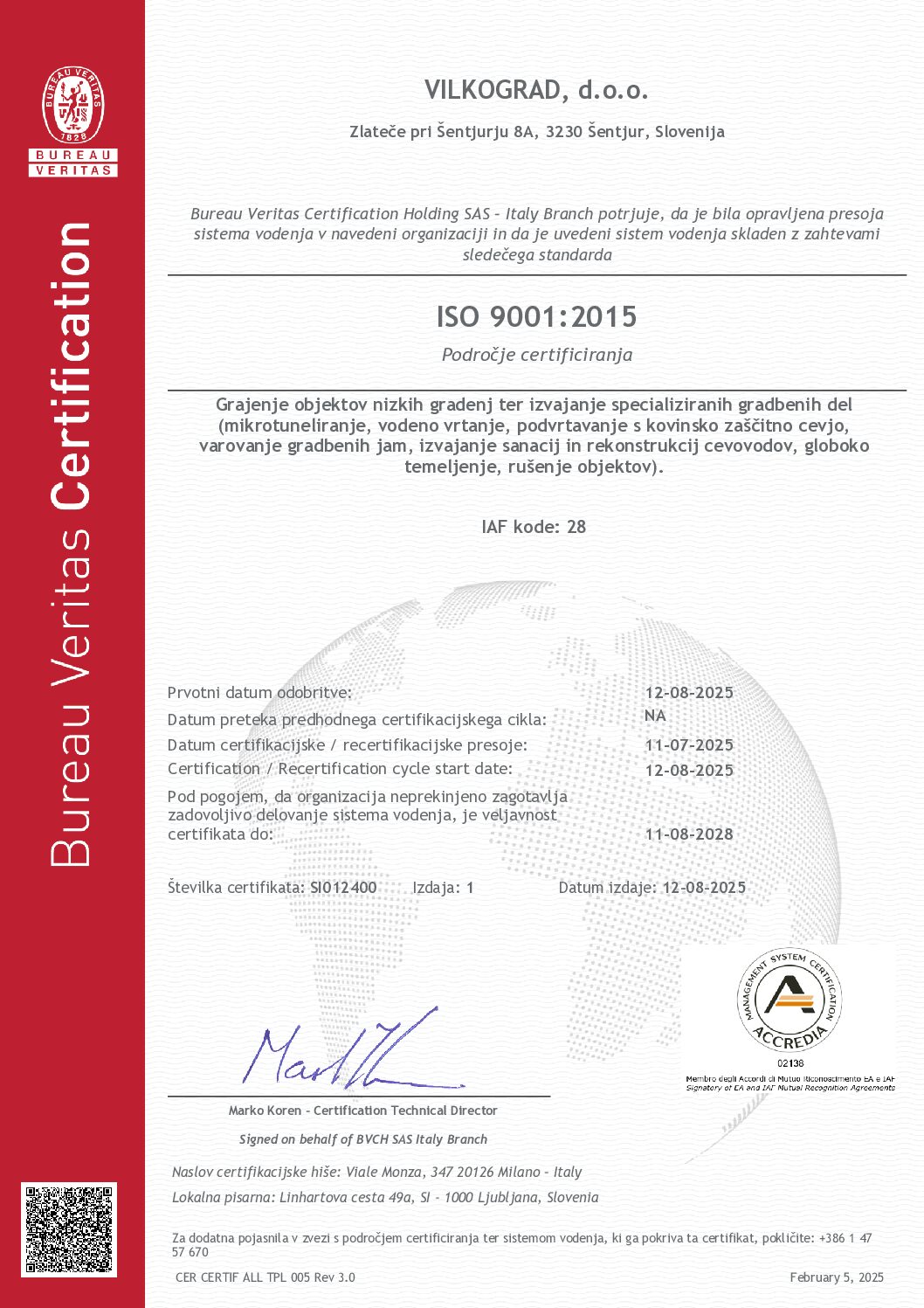 Podjetje Vilkograd pridobilo certifikat ISO 9001:2015